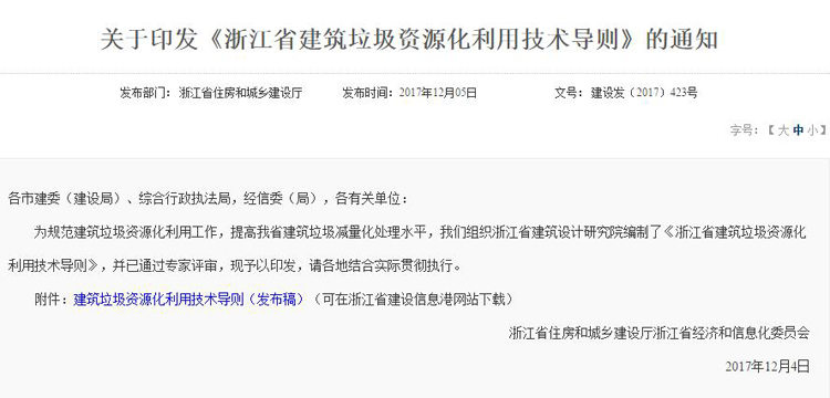 為規(guī)范建筑垃圾資源化利用工作,提高我省建筑垃圾減量化處理水平,我們組織浙江省建筑設(shè)計(jì)研究院編制了《浙江省建筑垃圾資源化利用技術(shù)導(dǎo)則》,并已通過專家評(píng)審,現(xiàn)予以印發(fā),請(qǐng)各地結(jié)合實(shí)際貫徹執(zhí)行。