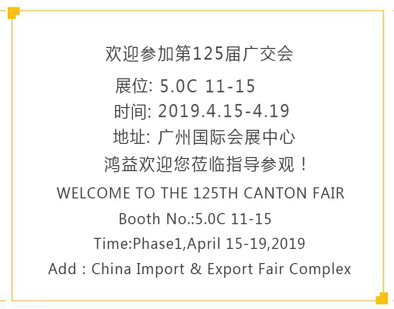 創(chuàng)新科技,行業(yè)領(lǐng)先!鴻益機(jī)械連續(xù)20多屆參與廣交會(huì),2019春季中國進(jìn)出口產(chǎn)品交易會(huì),再次如約而至。鴻益機(jī)械帶您領(lǐng)略科技創(chuàng)新技術(shù),歡迎全球新老顧客蒞臨參觀指導(dǎo),鴻益機(jī)械期待您的到來!