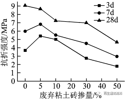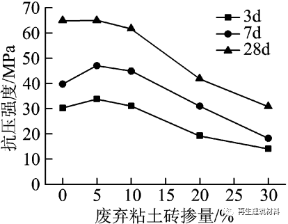 (3) 摻量大于 10% 后,廢棄混凝土水泥膠砂強度較廢棄粘土磚水泥的高。廢棄混凝土中含有部分未水化的水泥顆粒, 具有一定的水化活性。同時廢棄混凝土中碳酸鈣含量高, 在水化過程可與熟料的C3A 和 C4AF 反應生成水化碳鋁酸鈣 , 可以與其他水化產(chǎn)物相互搭接,使體系結構更加密實,增強體系的強度。