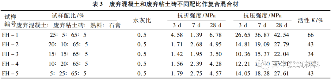 (1) 水泥熟料摻廢棄混凝土和廢棄粘土磚作混合材,降低了水泥熟料的強度。究其原因,水泥強度主要來源于水泥熟料的水化產(chǎn)物 C-S-H 強度, 因廢棄混凝土和廢棄粘土磚的水化活性不及水泥熟料,樣品水泥總體的水化活性有所降低,降低了水泥強度。